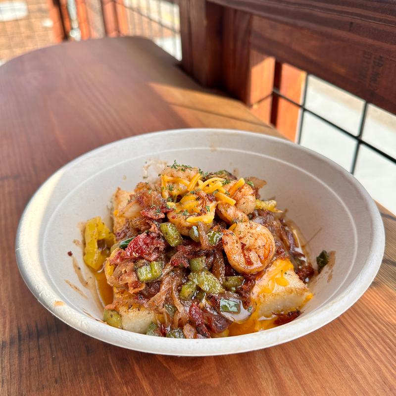 Sautéed Shrimp in Bacon Fat with Bacon, Green Peppers, Caramelized Onions, Banana Peppers and Scallions. Served on a Grilled Grit Cake with Cheddar Cheese.