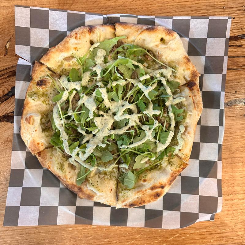 Nut-Free Basil Pesto, Mozzarella, Sausage, Red Onion, Finished with Arugula and Herb Aioli