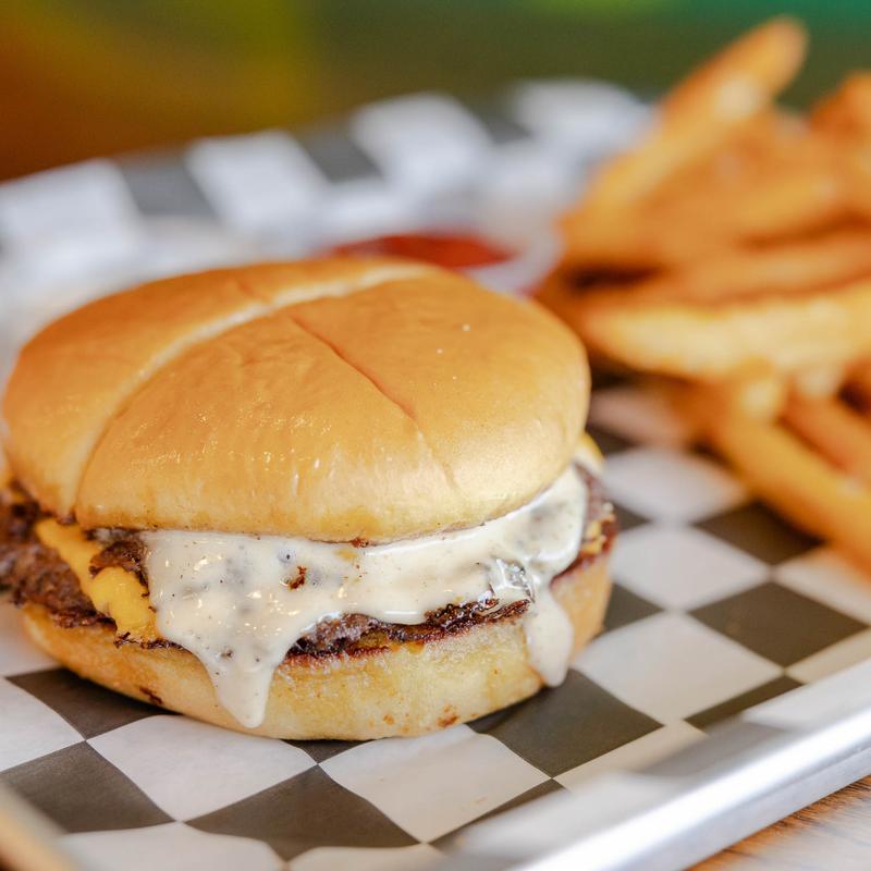 Two Angus Patties Grilled on the Flattop, Covered in American Cheese and Pasture Sauce on a Potato Bun