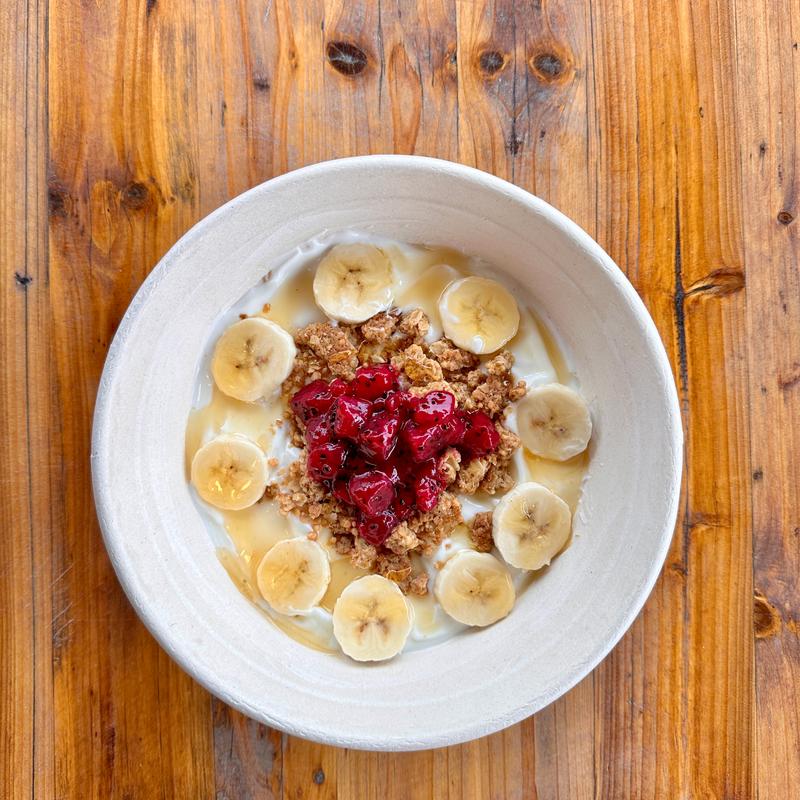 Vanilla Greek Yogurt, Honey & Oat Granola, Dragonfruit, Banana. Topped with Honey.