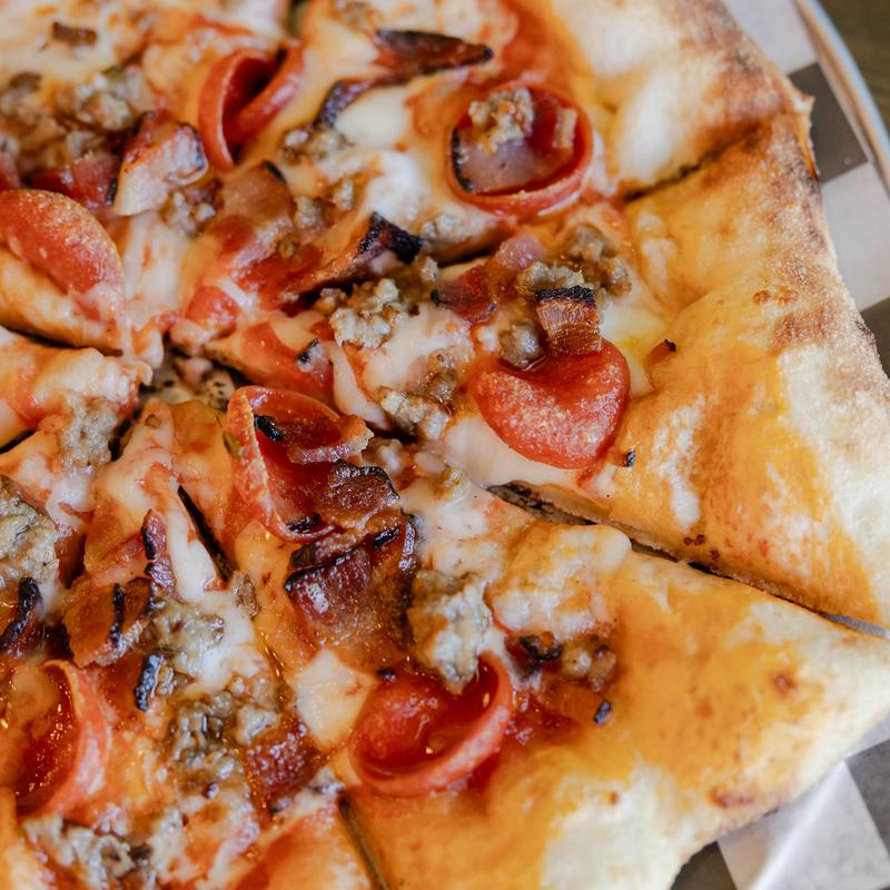 Mozzarella Cheese, Pepperoni, Sausage, and Bacon on our Red Sauce Base
